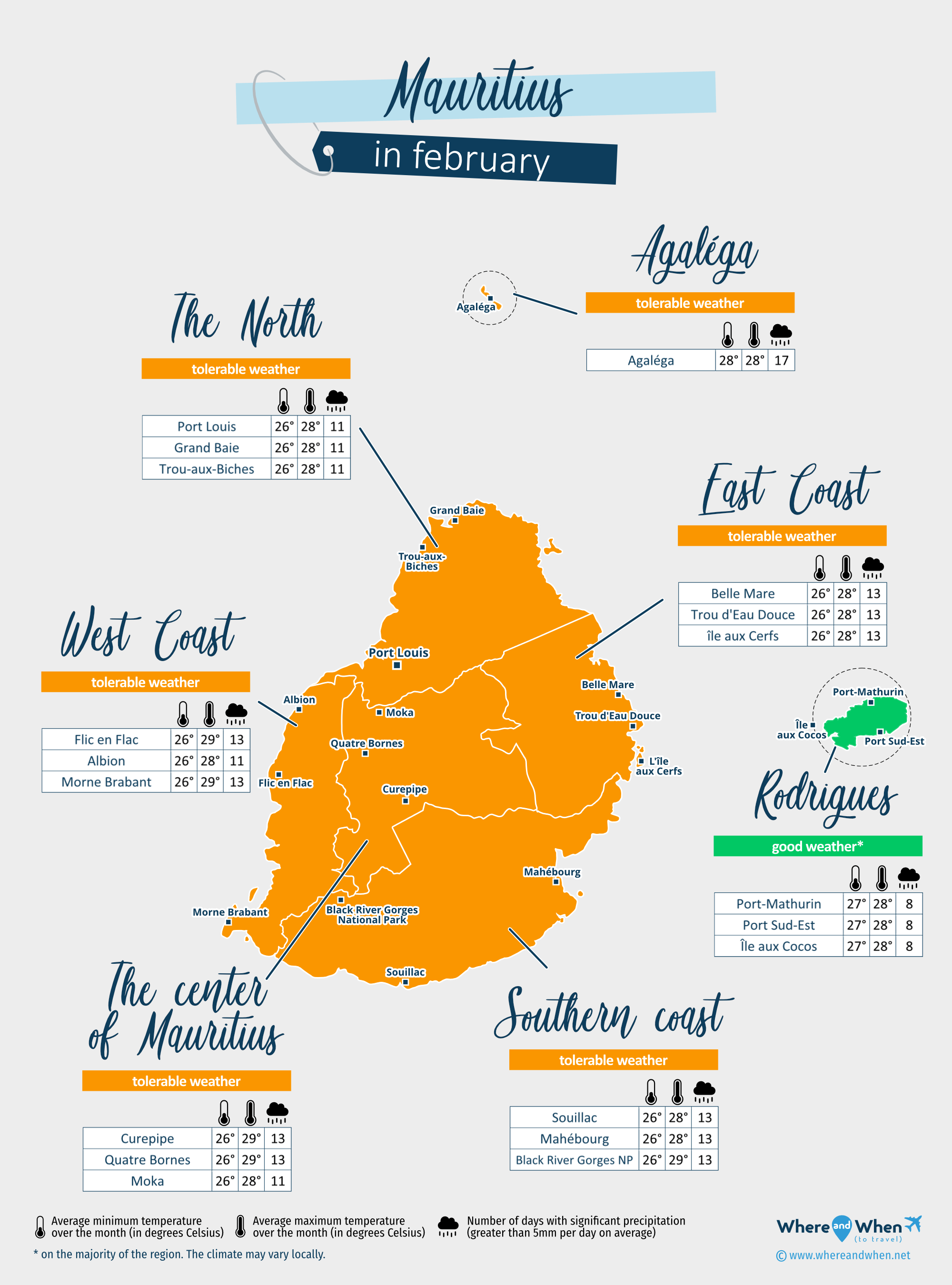 The climate in Mauritius in february ranges from good to tolerable depending on the region and city.