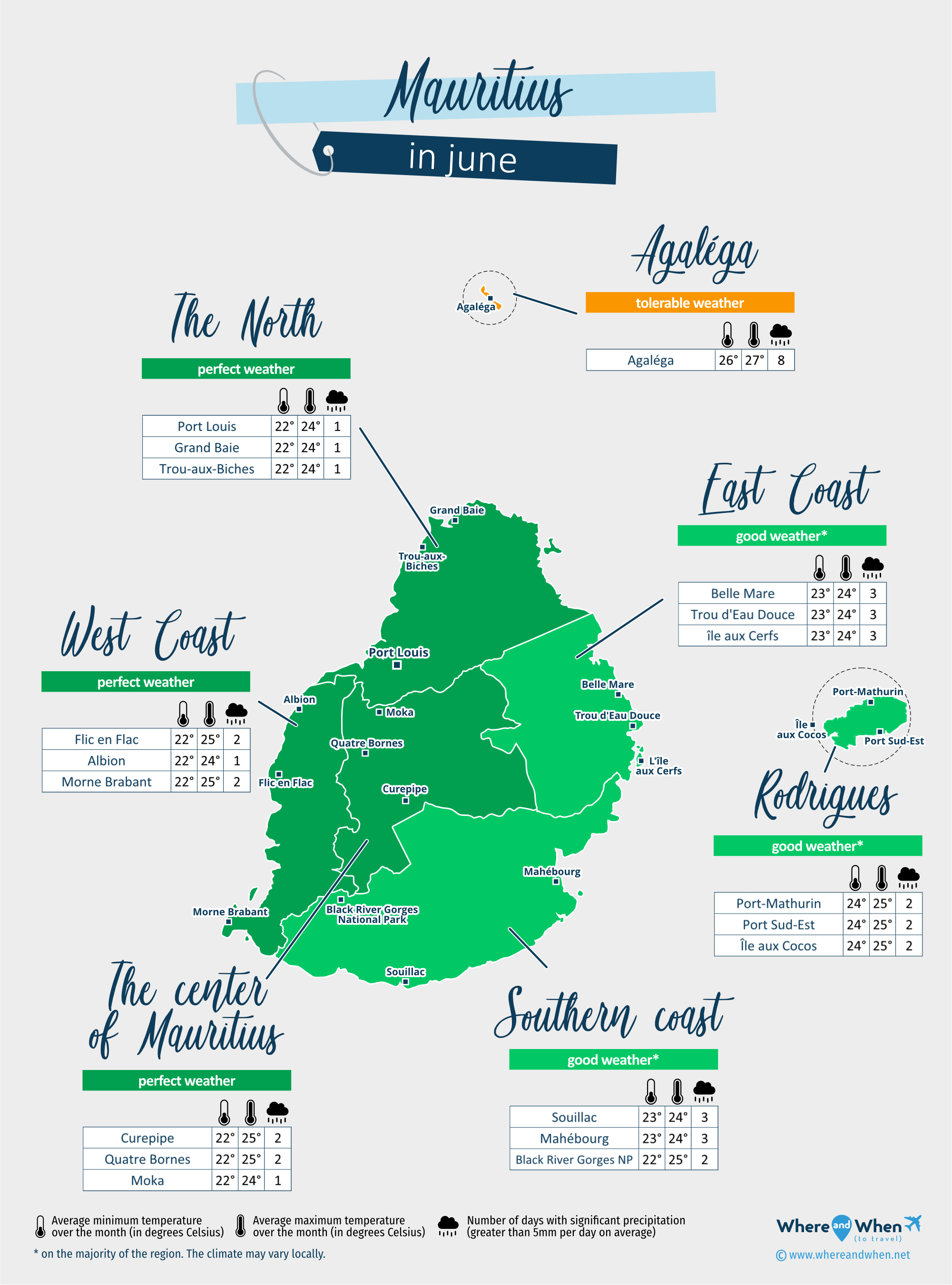 The climate in Mauritius in june ranges from perfect to good depending on the region and city.