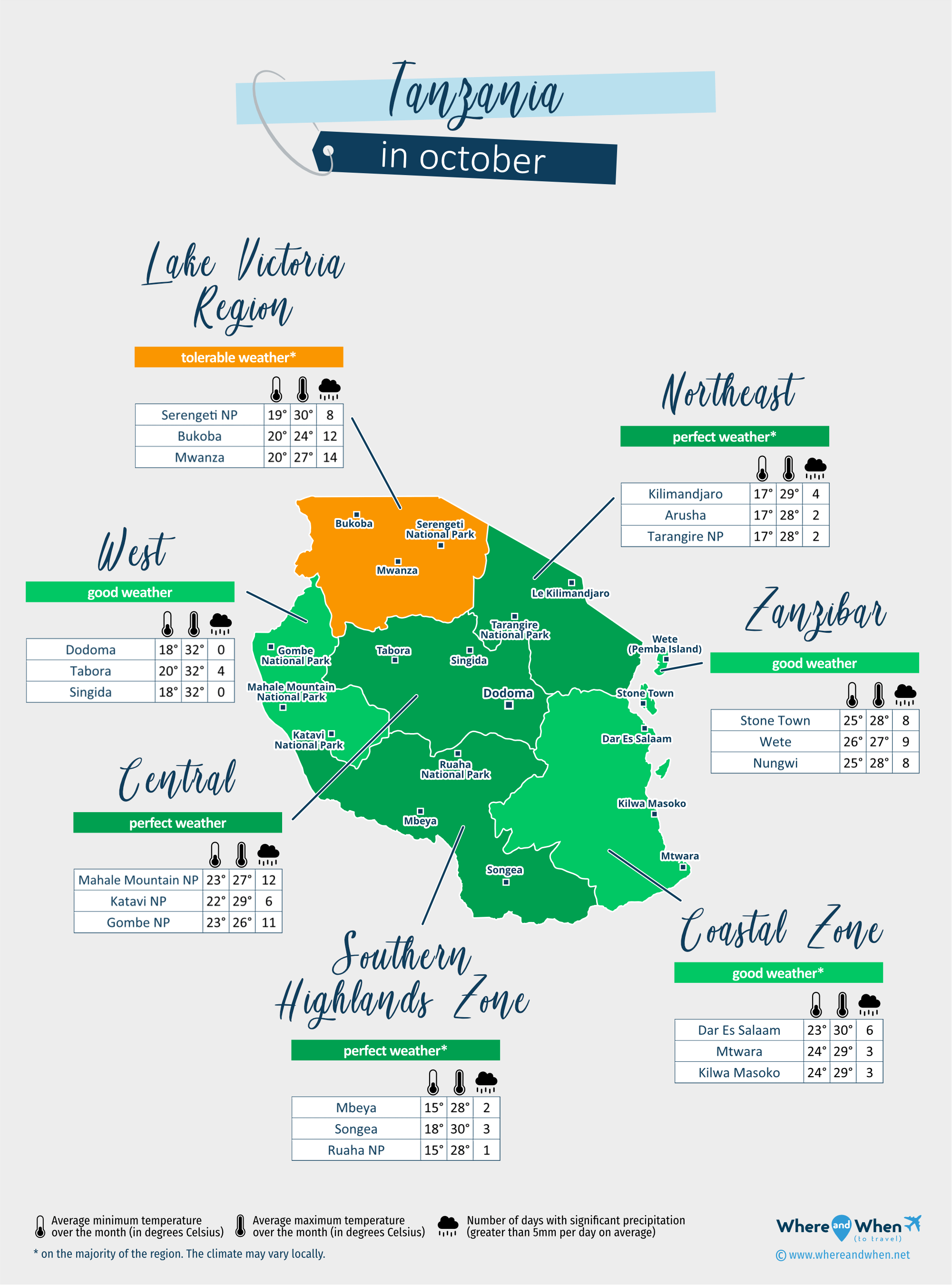The climate in Tanzania in october ranges from perfect to good depending on the region and city.