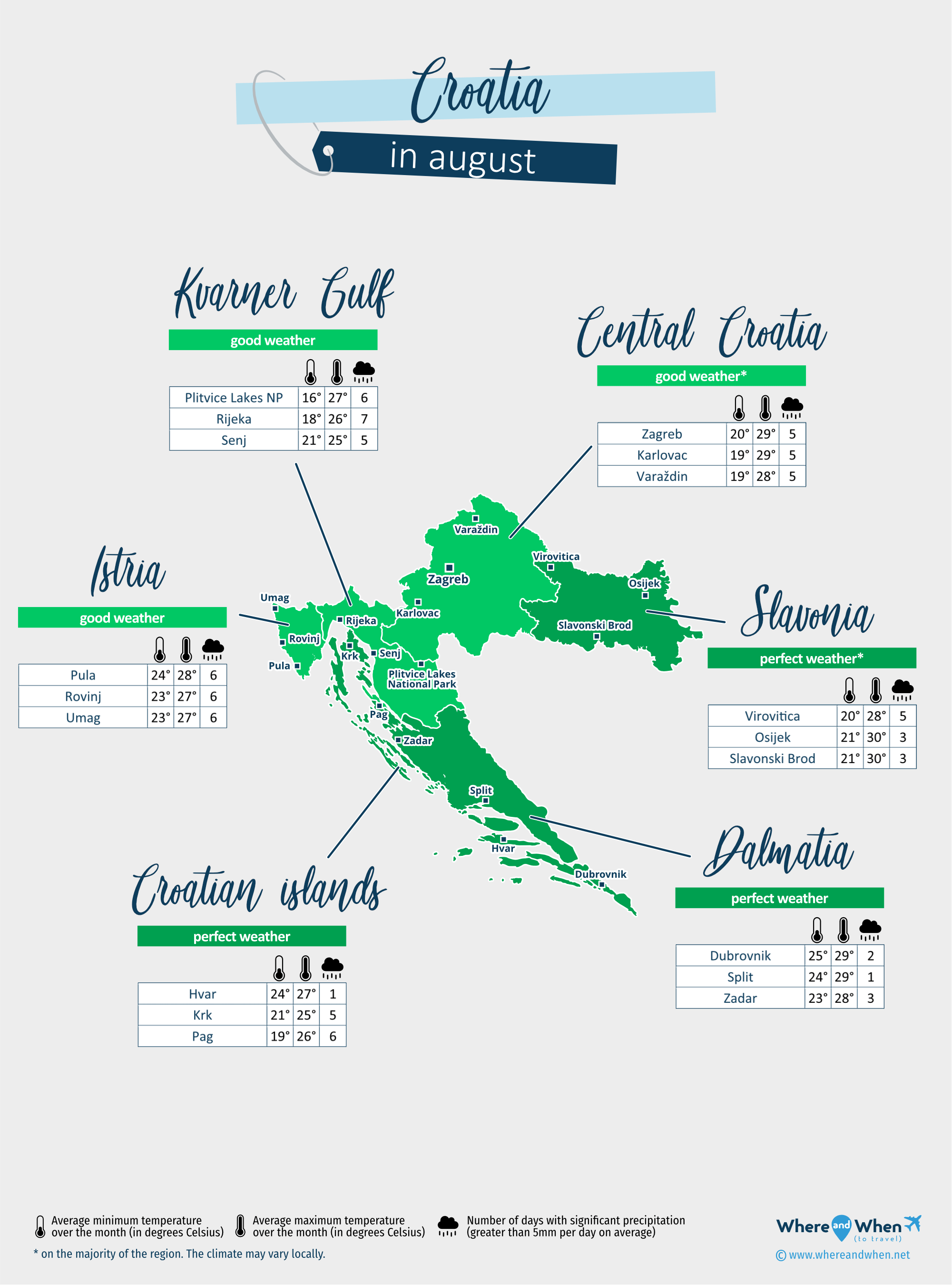 The climate in Croatia in august ranges from perfect to good depending on the region and city.