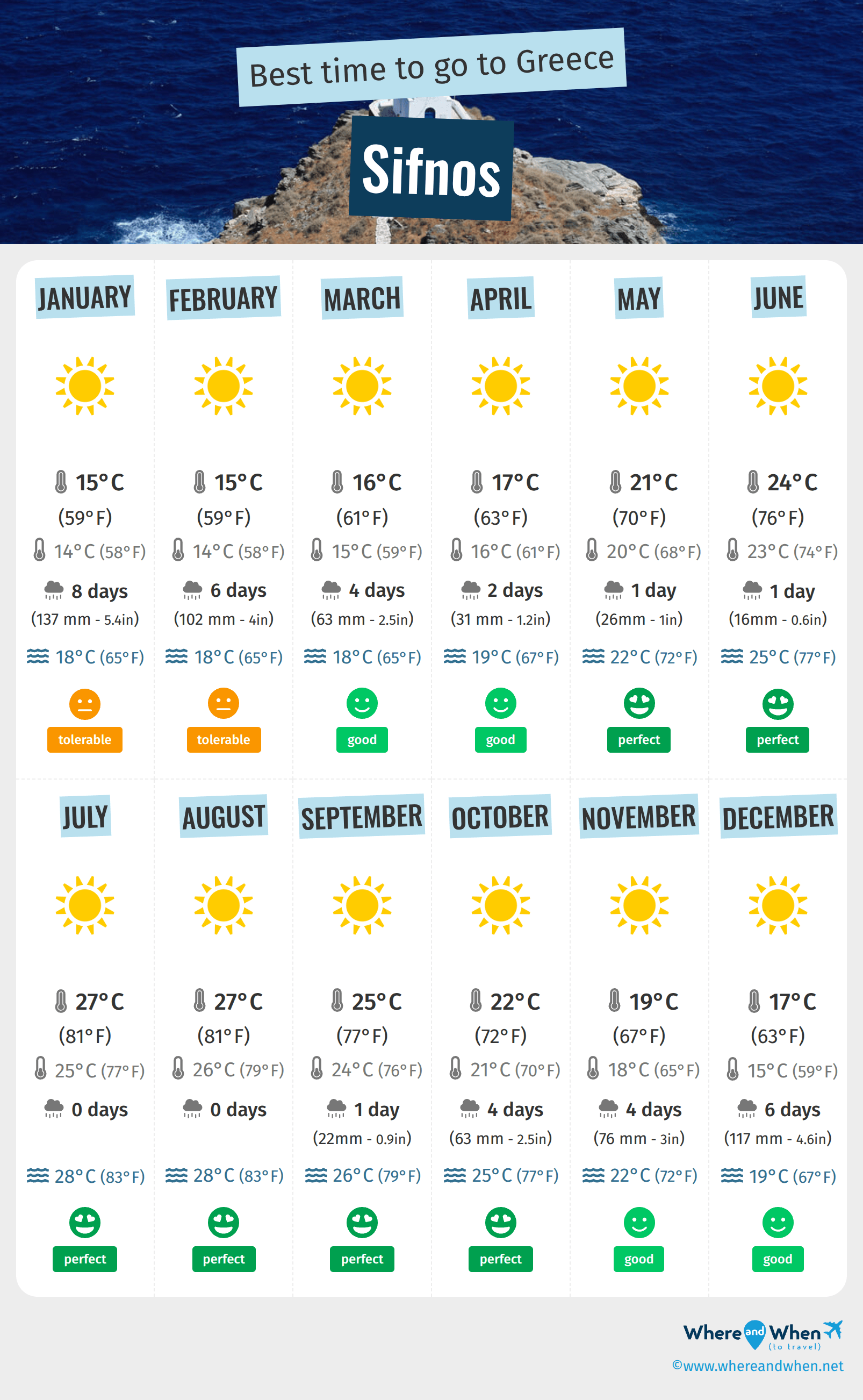 - The best months for good weather in Sifnos are March, April, May, June, July, August, September, October, November and December