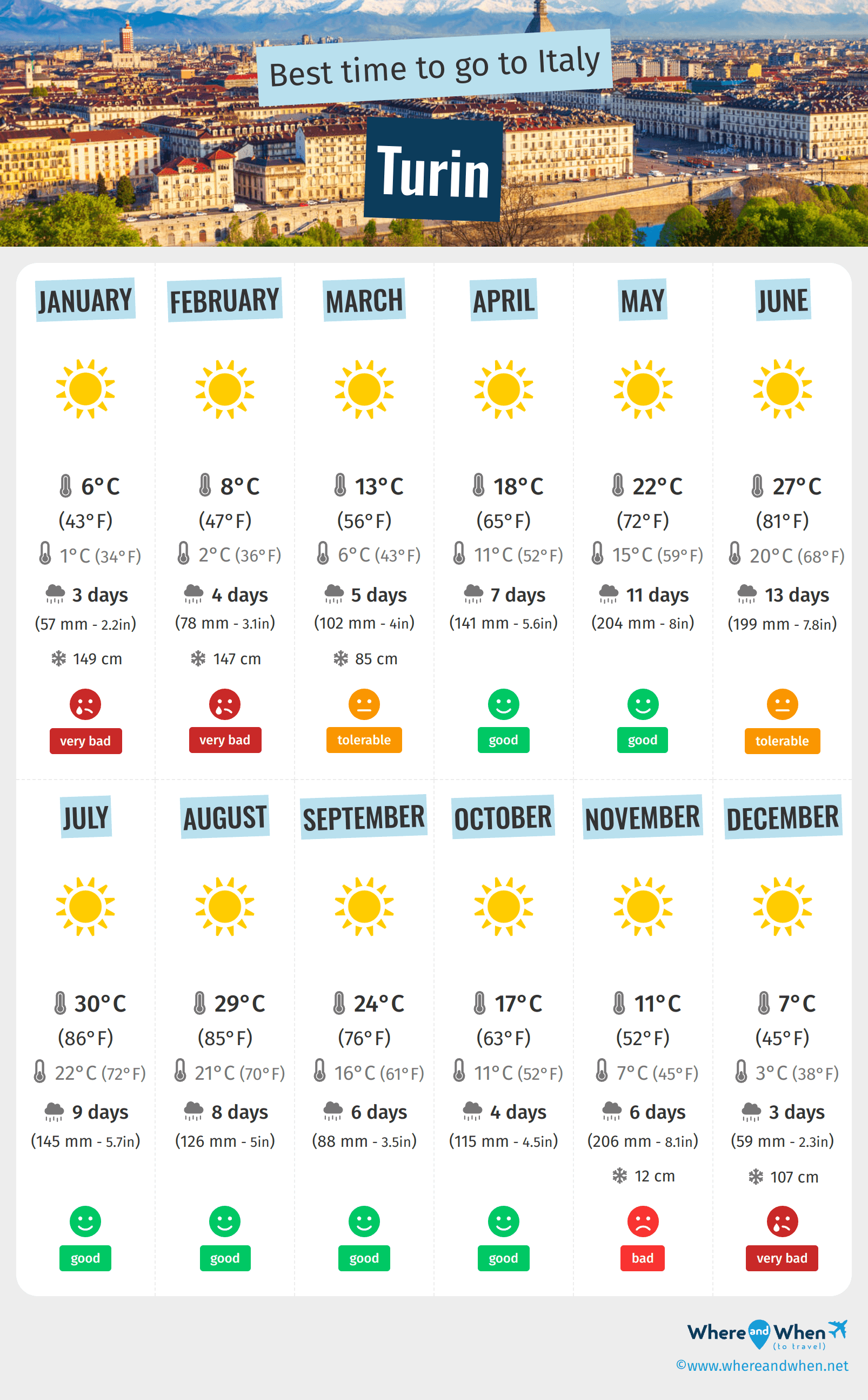 When is the best time to go to Turin? Here's some information to help you in your decision: