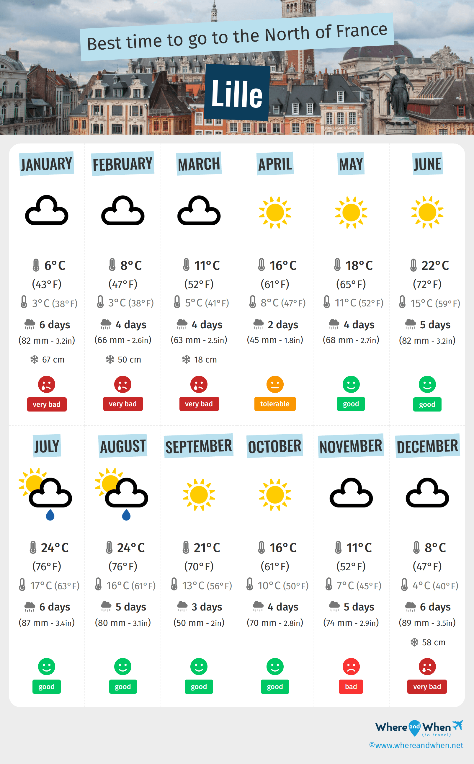 - The best months for good weather in Lille are May, June, July, August, September and October
