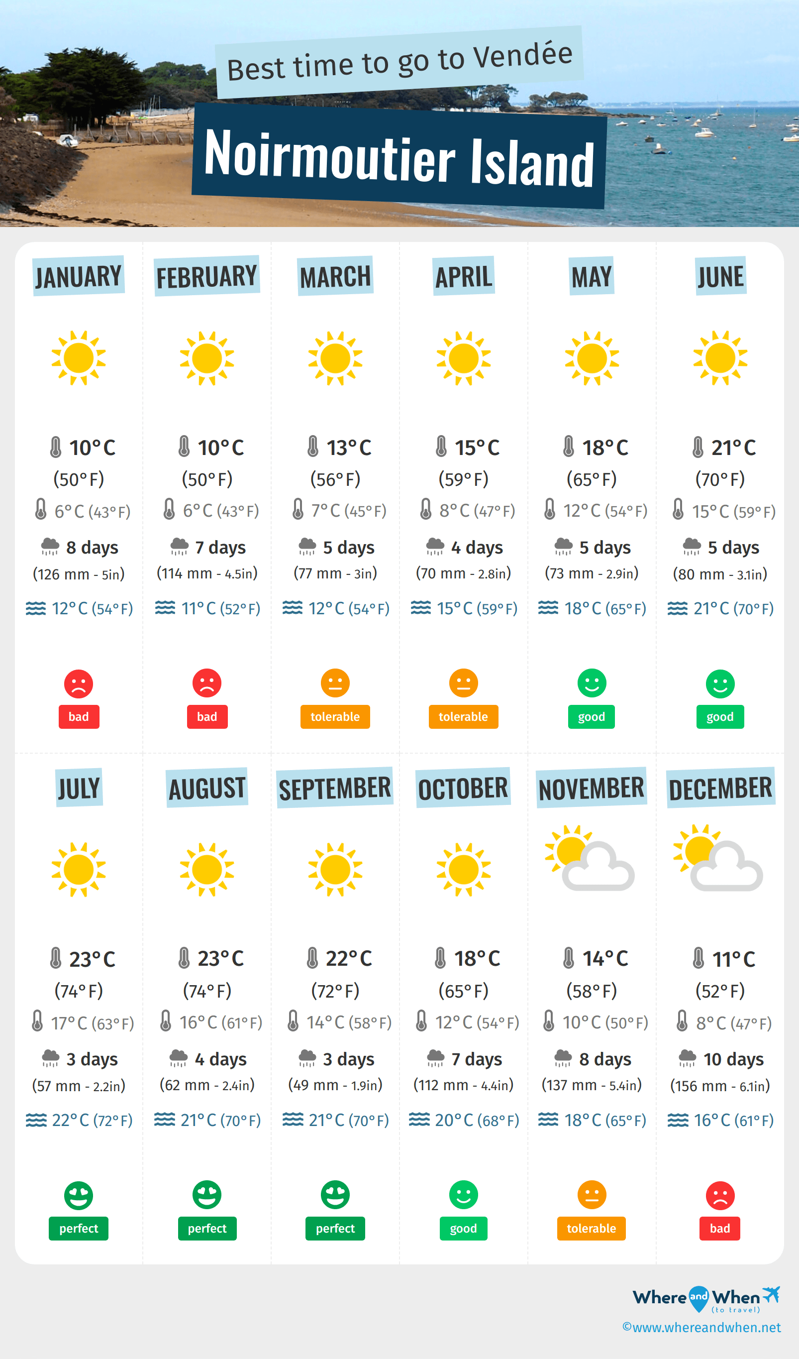 - The best months for good weather in Noirmoutier Island are May, June, July, August, September and October