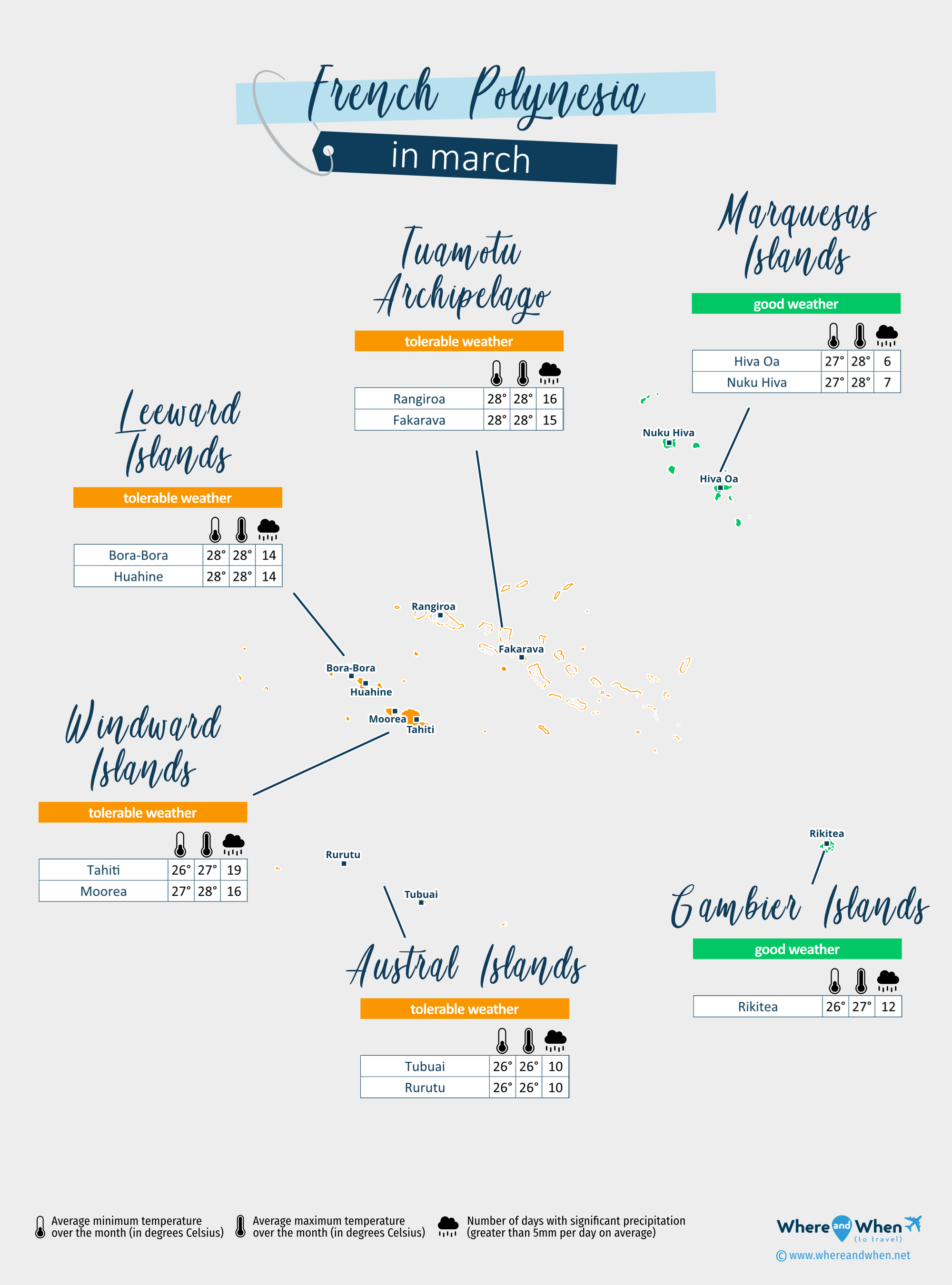 | Austral Islands (Tubuai, Rurutu, Raivavae...) | 81°F | 10 days | 83°F | tolerable weather |