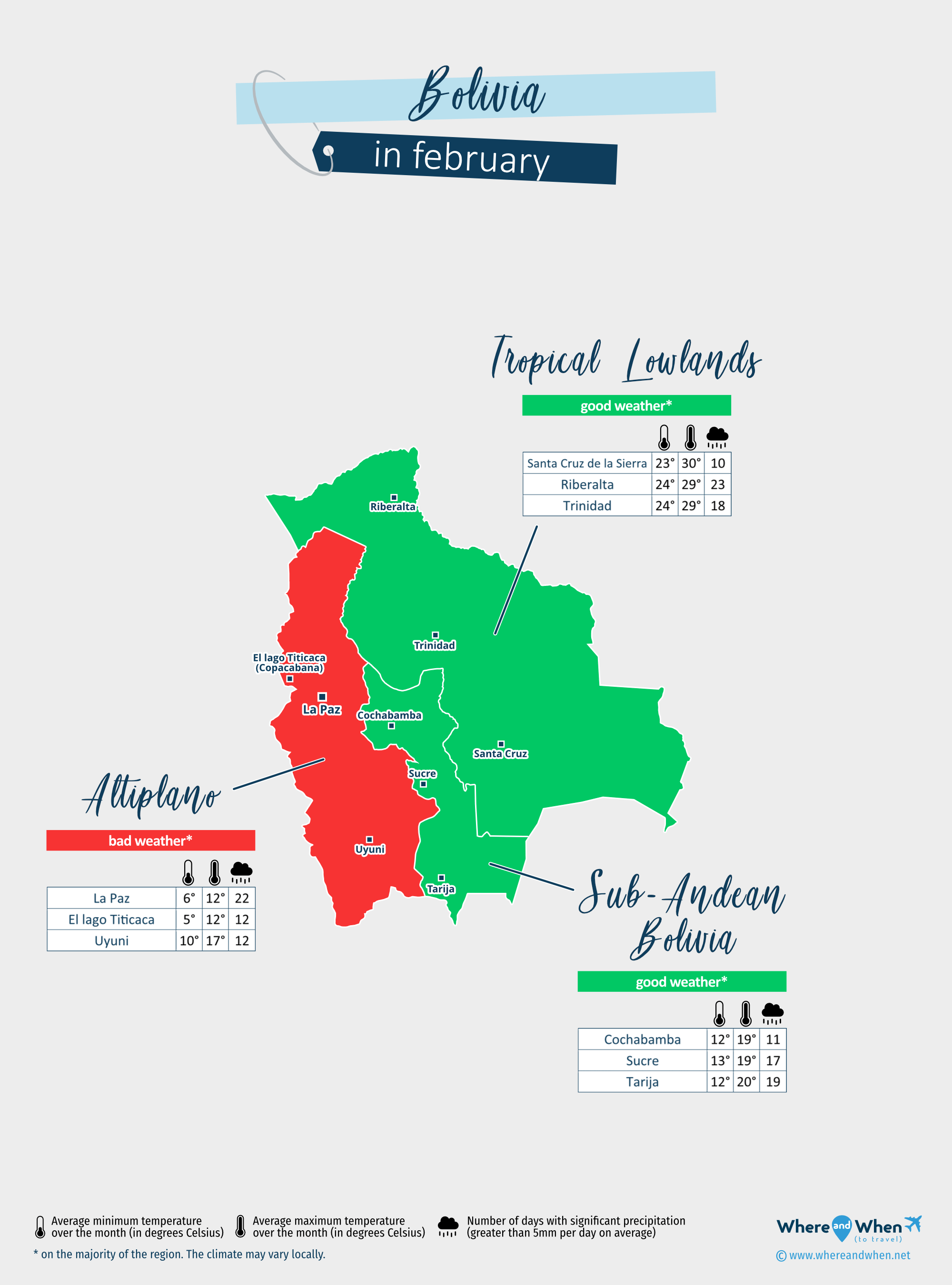 The climate in Bolivia in february ranges from good to very bad depending on the region and city.