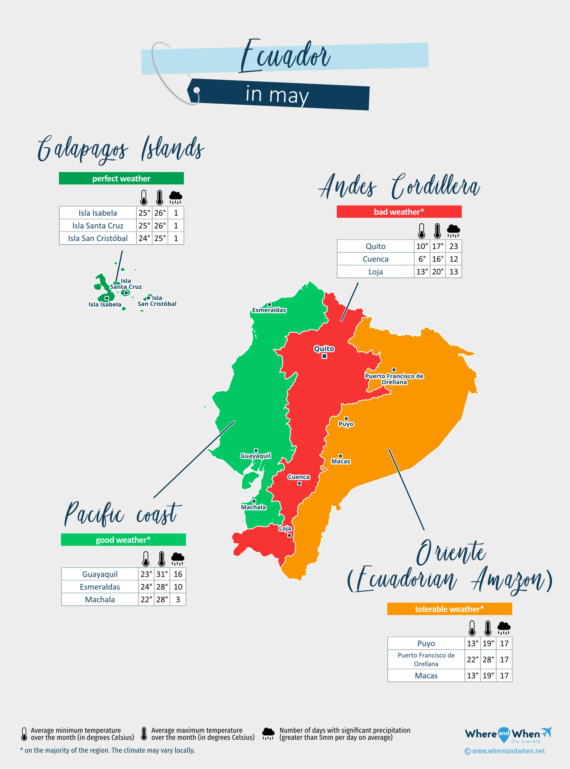 The climate in Ecuador in may ranges from perfect to bad depending on the region and city.